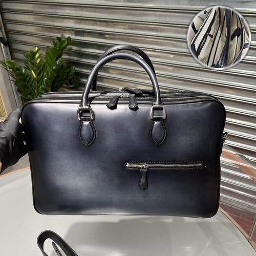 고객님께서 지금보시고 계시는 상품은 넉넉한 수납력과 세련된 비즈니스 실루엣을 갖춘 벨루티 가죽 노트북 브리프케이스로, 업무와 이동이 많은 일상에서 활용하기 좋은 고급 서류가방입니다. 프랑스산 A급 송아지 가죽을 사용하여 표면이 부드럽고 밀도 높은 가죽 질감을 제공하며, 전통적인 수작업 착색 공정을 통해 깊이 있는 블루 컬러와 자연스러운 가죽 음영이 표현됩니다. 가방 전체는 구조적인 패턴으로 제작되어 노트북과 서류를 수납해도 형태가 안정적으로 유지되며, 상단 더블 핸들 구조로 손에 들었을 때 균형감 있는 그립감을 제공합니다. 전면 지퍼 포켓이 적용되어 자주 사용하는 소지품을 빠르게 꺼낼 수 있도록 설계되었으며, 내부 공간은 노트북, 태블릿, 문서, 파우치 등 다양한 비즈니스 필수품을 효율적으로 정리할 수 있습니다. 벨루티 특유의 고급 가죽 질감과 클래식한 디자인이 조화를 이루어 정장과 비즈니스 스타일에 자연스럽게 어울리는 가죽 브리프케이스입니다.