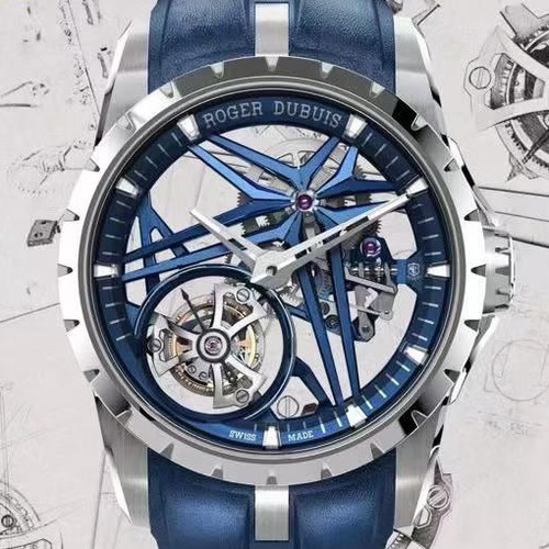 로저드뷔 엑스칼리버 더블 밸런스 플라잉 투르비용 모델은 하이엔드 워치메이킹 기술과 독창적인 디자인을 결합한 대표적인 컴플리케이션 시계입니다. 엑스칼리버 컬렉션 특유의 대담한 케이스 구조와 스켈레톤 다이얼 디자인을 통해 내부 무브먼트의 정교한 구조를 그대로 감상할 수 있도록 설계되었습니다.