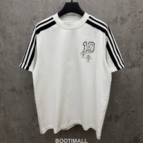 고객님께서 지금보시고 계시는 상품은 Chrome Hearts Cross Embroidery Raglan Short Sleeve T-Shirt 9609 크롬하츠 크로스 자수 라글란 반팔 티셔츠 9609입니다. 26SS 시즌 컬렉션으로 선보인 이 제품은 360g 100% 순면 특수 32수 더블 원사 스웨트 패브릭을 사용하여 프리미엄 착용감과 내구성을 자랑합니다. 어깨에서 소매까지 이어지는 라글란 디자인에 블랙 3라인 스트라이프가 적용되어 스포티하면서도 세련된 분위기를 연출합니다. 전면과 후면에는 독일 수입 기계 자수로 제작된 입체적인 크로스 패턴이 중공 자수 기법으로 겹겹이 표현되어 깊이감과 고급스러움을 더했으며, 정교한 메탈 하드웨어 장식이 크롬하츠 특유의 록 감성을 완성합니다. 더블 니들 스티치 크로스 심 공법으로 마감되어 세부적인 완성도가 뛰어나며, 오리지널 메인 라벨과 워싱 행택이 부착되어 정품임을 보증합니다.