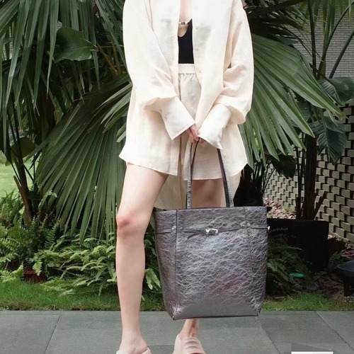 메탈릭 실버 톤 카프스킨 레더로 제작된 토트백입니다. 외부는 자연스러운 링클 텍스처가 살아있는 가죽 패널 구조로 마감되어 있으며, 전면 포켓과 버클 디테일이 포인트로 구성됩니다. 상단은 오픈 형태로 수납이 빠르고, 더블 핸들로 핸드 캐리 및 숄더 연출이 가능합니다. 내부 수납 구성과 클로저 상세는 .