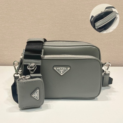 프라다의 아이코닉한 삼각 로고가 돋보이는 클래식 메신저백 디자인입니다.