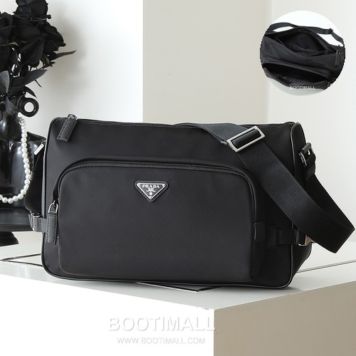 리나일론 소재 바디에 사피아노 소가죽 디테일을 더한 라지 메신저백입니다. 심플한 라인과 실용적인 현대적 디테일로 스포티한 기능성을 강조했으며, 에나멜 처리된 메탈 삼각 배지가 포인트로 적용되어 있습니다. 넉넉한 내부 용량을 갖춘 구성으로 명시되어 다양한 소지품 수납에 적합합니다. 스트랩 길이 조절, 내부 포켓 구성, 클로저 방식은 .