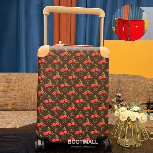 트롤리형 캐리어로, 코팅 캔버스 소재와 모노그램 패턴 위에 체리 모티프가 적용된 디자인이 특징입니다. 사이즈는 높이 50×너비 36×두께 18cm로 표기되어 기내용으로 사용 가능합니다. 상단 핸들과 트롤리 구조를 갖춘 형태로 여행 및 출장 이동 시 활용도가 높습니다. 포장 구성은 종이 박스 포장으로 제공됩니다.