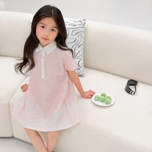 고객님께서 지금보시고 계시는 상품은 여아용 반소매 폴로 칼라 드레스입니다. 상단은 단정한 솔리드 컬러로 마감되고, 하단으로 갈수록 로고 패턴이 촘촘하게 배치된 모노그램 디자인이 특징입니다. 대비되는 화이트 칼라와 버튼 플래킷이 깔끔한 포인트를 더해주며, 일자 실루엣으로 편안하게 떨어지는 기장감이 활동성이 많은 아이들에게 적합합니다. 봄여름 시즌에 단독으로 착용하기 좋고, 스니커즈나 샌들과 함께 캐주얼하게 매치하기 좋은 아이템입니다.