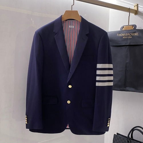 고객님께서 지금보시고 계시는 상품은 남성용 울 싱글 블레이저입니다. 이탈리아 정방 울 원단을 사용해 높은 밀도와 섬세한 터치감을 갖추었으며, Super 160s급으로 소개되는 가늘고 촘촘한 섬유가 특징입니다. 전체적으로 블루 컬러를 메인으로 하고, 안감에는 삼색 로고 스트라이프 안감을 사용해 브랜드 특유의 아이코닉한 무드를 더했습니다. 소매에는 네 줄 배색 스트라이프를 색직 기법으로 표현해 입체감을 살렸고, 앞 여밈에는 골드 톤 메탈 버튼 세 개를 배치해 클래식한 포인트를 주었습니다. 평노치 라펠과 사이드 벤트, 슬림 핏 패턴으로 현대적인 실루엣을 구현해 비즈니스와 세미 캐주얼 스타일 모두에 잘 어울립니다. 어깨와 허리선 비율을 세심하게 설계해 착용 시 균형 잡힌 라인을 보여주며, 소매 끝에는 삼색 테이프와 금속 버튼 디테일을 더해 완성도를 높였습니다. 가을 시즌 단독 착용은 물론 셔츠, 니트, 타이와 함께 다양한 레이어드 연출이 가능해 활용도가 높은 아이템입니다.