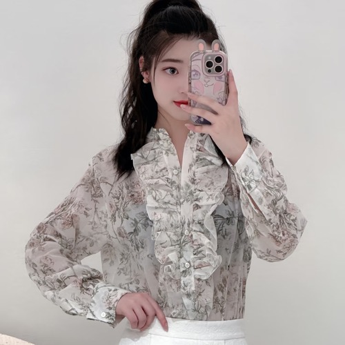 고객님께서 지금보시고 계시는 상품은 잔잔한 플라워 패턴과 주름 디테일 칼라가 돋보이는 여성용 셔츠입니다. 작은 꽃무늬를 은은하게 배치해 부드러운 분위기를 더해주며, 전체적으로 가볍고 편안한 착용감을 지향하는 디자인입니다. 과한 장식 없이 심플한 실루엣으로 다양한 하의와 매치하기 좋고, 단독으로는 물론 이너 셔츠로도 활용도가 높습니다. 일상적인 외출부터 오피스 캐주얼까지 폭넓게 스타일링할 수 있는 아이템입니다.