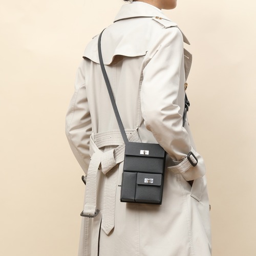 고객님께서 지금보시고 계시는 상품은 엡솜 송아지가죽으로 제작된 파우치입니다. 컴팩트한 세로형 실루엣에 3개의 내부 수납 칸을 더해 작은 소지품을 효율적으로 정리할 수 있도록 구성했습니다. 길이 조절이 가능한 스트랩을 활용해 원숄더, 양쪽 어깨, 허리 착용 등 다양한 방식으로 연출할 수 있으며, 팔라듐 도금 메탈 디테일로 마감해 깔끔한 인상을 줍니다. 프랑스에서 제작된 제품으로, 일상 외출부터 여행 시 서브 백으로 활용하기 좋습니다.