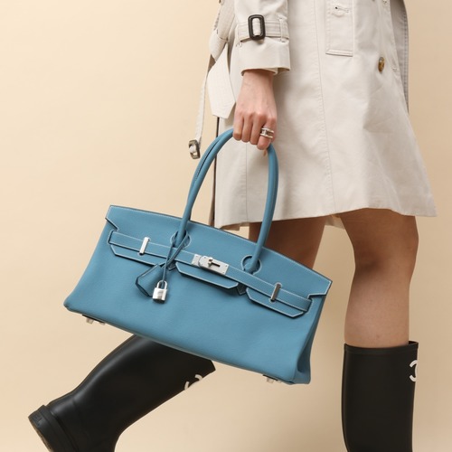고객님께서 지금보시고 계시는 상품은 토고 송아지가죽으로 제작된 토트백입니다. 가로 42cm의 여유 있는 사이즈와 구조적인 실루엣으로 다양한 소지품을 안정적으로 수납할 수 있습니다. 특유의 입체적인 그레인 텍스처가 돋보이는 토고 가죽을 사용해 견고한 사용감을 제공하며, 손에 쥐기 편한 상단 핸들과 함께 숄더로도 착용 가능한 스트랩 구성이 특징입니다. 메탈릭한 팔라듐 도금 하드웨어와 잠금 장식이 더해져 실용성과 장식을 동시에 충족하며, 일상부터 여행까지 폭넓게 활용하기 좋습니다.