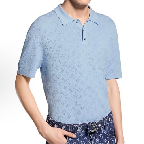 Louis Vuitton Monogram Mesh Polo Cotton Tencel Blend Lavender Blue Short Sleeve Knit 루이비통 모노그램 메쉬 폴로 코튼 텐셀 블렌드 라벤더 블루 반소매 니트 |