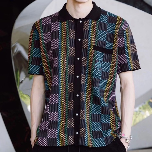 고객님께서 지금보시고 계시는 상품은 코튼 소재로 제작된 남성용 반팔 셔츠입니다. 블랙을 베이스로 컬러풀한 자카드 직조를 사용해 클래식한 다미에 체크 패턴을 재구성하고, 세로 방향의 컬러 스트라이프를 더해 존재감 있는 디자인을 완성했습니다. 전면에는 카라와 버튼 여밈이 적용되어 셔츠의 정돈된 실루엣을 유지하며, 왼쪽 가슴 패치 포켓에는 동색 계열 자카드로 브랜드 레터링 디테일이 더해져 포인트가 됩니다. 루즈한 드롭 숄더와 약간 곡선 처리된 밑단으로 자연스럽게 떨어지는 실루엣을 연출할 수 있어, 단독 착용은 물론 이너와 함께 레이어드하기에도 적합한 아이템입니다. 주원단은 코튼 100%이며, 보조 원단에 폴리에스터가 포함되어 자카드 패턴의 입체감을 살려 줍니다.
