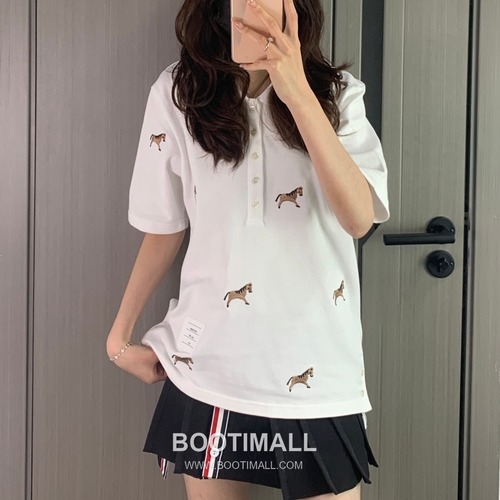 고객님께서 지금보시고 계시는 상품은 전면에 말 자수 패턴이 더해진 반팔 폴로 셔츠입니다. 클래식한 카라와 버튼 플래킷 디자인으로 단정한 실루엣을 유지하면서도, 몸판 전체에 반복된 말 모티프 자수가 경쾌한 포인트를 더해줍니다. 밑단 사이드 버튼 디테일과 트리컬러 테이프 장식이 적용되어 브랜드 특유의 아이코닉한 무드를 느낄 수 있으며, 반팔 기장으로 봄여름 시즌에 활용도가 높습니다. 네이비, 화이트, 그레이 세 가지 컬러와 1부터 5까지 폭넓은 사이즈 구성으로 남녀 모두 편안하게 선택할 수 있는 아이템입니다.