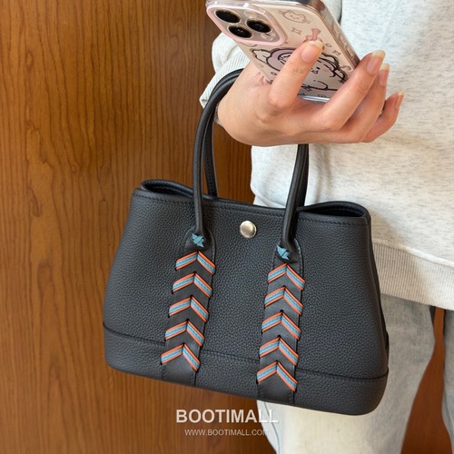 고객님께서 지금보시고 계시는 상품은 엔토고·스위프트 송아지 가죽으로 제작된 토트백입니다. 전면에 위빙 장식 디테일을 더해 입체적인 포인트를 살렸으며, 블랙 컬러로 다양한 스타일에 매치하기 좋습니다. 가든 라인의 구조적인 실루엣을 바탕으로 데일리 소지품 수납에 활용하기 좋은 구성이며, 토트 형태로 간편하게 착용할 수 있습니다.