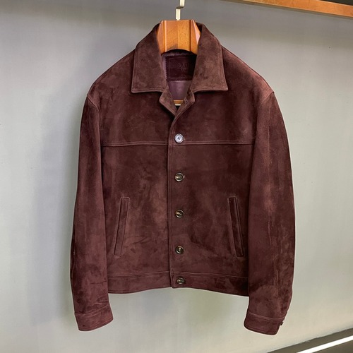 고객님께서 지금보시고 계시는 상품은 남성용 스웨이드 램스킨 자켓입니다. 호주산 버건디 컬러의 반스웨이드 양가죽을 사용해 부드러운 촉감이 특징이며, 카라가 있는 디자인으로 캐주얼과 포멀 스타일에 모두 활용하기 좋습니다. 뒷카라 아래 삼각 로고 메탈 디테일이 적용되어 포인트가 되며, 촘촘한 스티치 마감으로 완성도를 더했습니다.