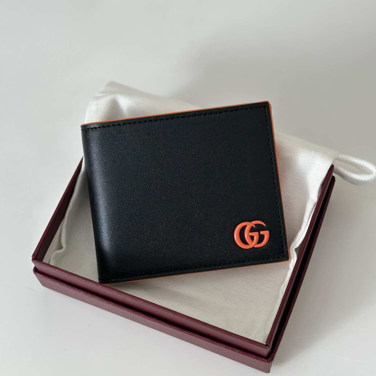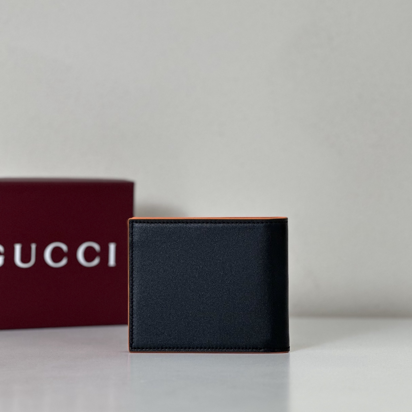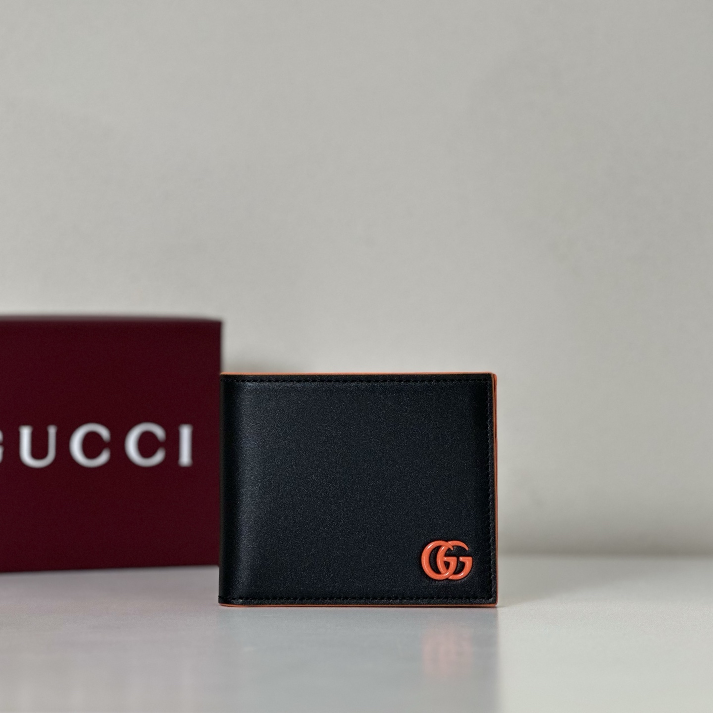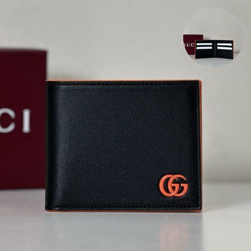 고객님께서 지금보시고 계시는 상품은 오렌지 컬러 포인트와 G 로고 디테일이 돋보이는 가죽 카드지갑입니다. 컴팩트한 사이즈로 포켓이나 미니백에 수납이 편리하며, 일상에서 카드와 소지품을 깔끔하게 정리하기 좋습니다.