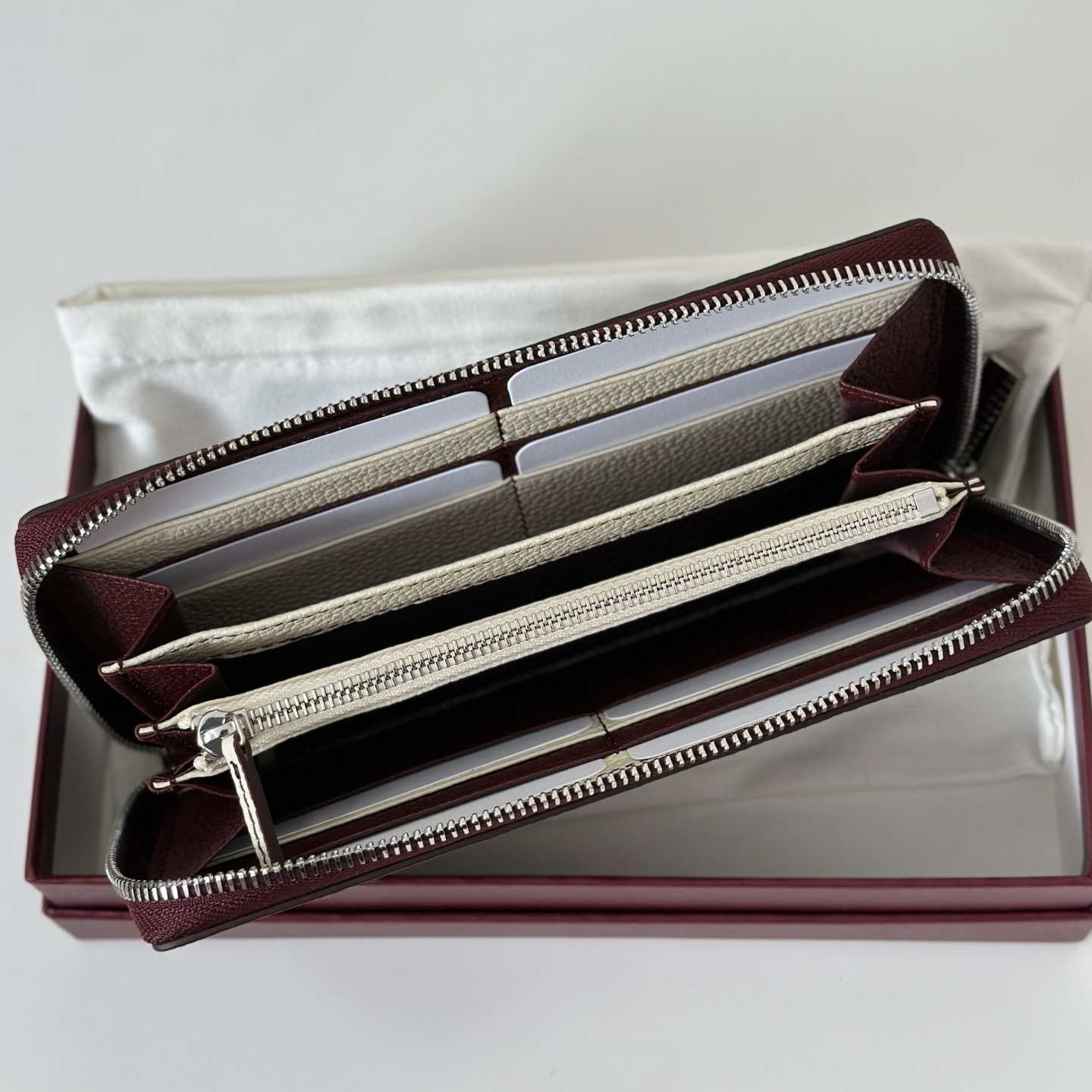 고객님께서 지금보시고 계시는 상품은 지퍼로 여닫는 집 어라운드 형태의 지갑입니다. 슬림한 직사각 실루엣으로 휴대가 간편하며, 내부 수납을 통해 카드와 지폐 등을 깔끔하게 정리할 수 있어 데일리로 활용하기 좋습니다.