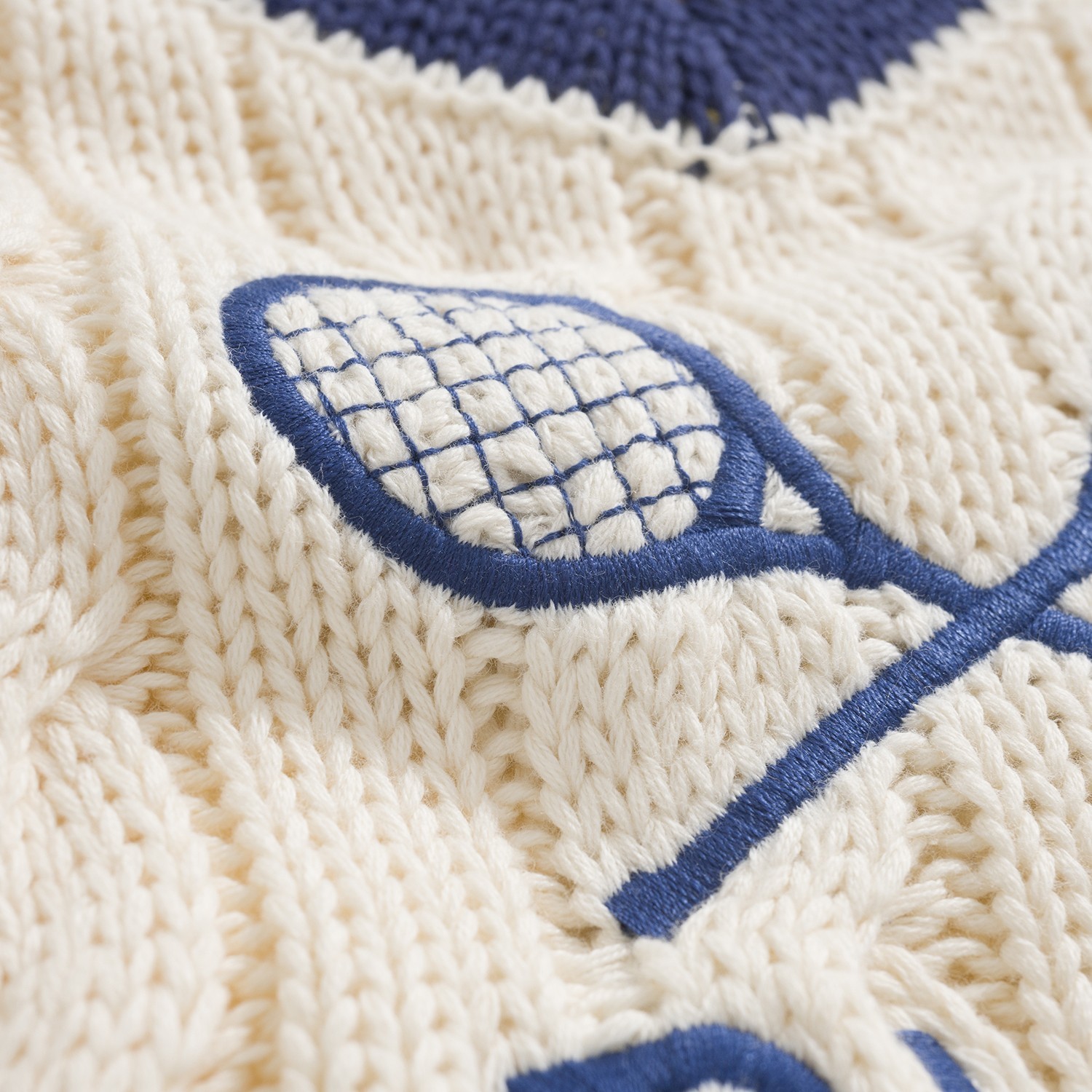 • 테니스 라켓 자수와 브이넥 스트라이프가 특징입니다.