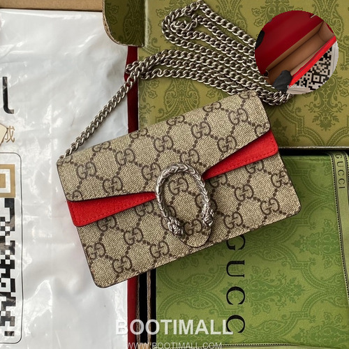 고객님께서 지금보시고 계시는 상품은 구찌의 대표 아이콘 Dionysus 라인의 미니 숄더백으로, GG Supreme 캔버스와 타이거 헤드 잠금장치가 조화를 이루는 모델입니다. 클래식한 GG 패턴과 메탈 디테일이 어우러져 세련되고 고급스러운 분위기를 완성하며, 컴팩트한 사이즈로 데일리 및 외출 시 활용도가 높습니다. 체인 스트랩을 활용해 숄더와 크로스 스타일로 다양하게 연출할 수 있으며, 필수 소지품을 간편하게 수납할 수 있는 실용적인 구조를 갖추고 있습니다. 구성품: 정품 박스, 더스트백, 쇼핑백, 구매 영수증 포함 컴팩트한 사이즈로 가볍고 휴대성 우수 아이코닉한 디자인으로 스타일 포인트 연출 체인 스트랩으로 다양한 착용 방식 가능 데일리 및 외출용으로 활용도 높은 미니백