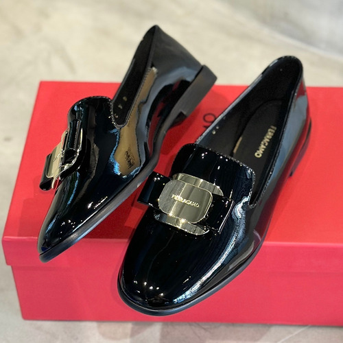 고객님께서 지금보시고 계시는 상품은 유광 페이턴트 송아지 가죽과 페라가모의 시그니처 바라 리본 장식이 조화를 이루는 살바토레 페라가모 로퍼 모카신입니다. 광택감이 뛰어난 에나멜 가죽이 세련되고 고급스러운 분위기를 연출하며, 부드러운 가죽 인솔이 적용되어 장시간 착용에도 편안한 착화감을 제공합니다. 앞코는 안정감 있는 스퀘어 토 형태로 제작되어 발볼에 구애받지 않고 편안하게 착용 가능하며, 상단에는 동일 톤 리본과 골드 톤 메탈 플레이트가 결합된 바라 장식이 적용되어 브랜드 특유의 우아한 감성을 강조합니다. 클래식한 로퍼 디자인에 현대적인 감각을 더해 데일리부터 오피스룩까지 다양한 스타일에 어울리는 실용적인 여성 슈즈입니다. 페라가모의 바라 리본 장식이 적용된 로퍼 모카신입니다. 유광 페이턴트 가죽으로 세련되고 고급스러운 분위기를 연출합니다. 스퀘어 토 디자인으로 발볼이 편안한 착용감을 제공합니다. 부드러운 가죽 인솔로 장시간 착용에도 편안함을 유지합니다. 데일리와 오피스룩 모두에 어울리는 활용도 높은 여성 로퍼입니다.