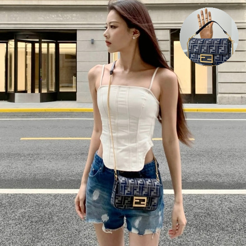 고객님께서 지금보시고 계시는 상품은 셔닐 소재의 스몰 바게트 숄더백입니다. 딥 네이비 그라데이션 FF 패턴과 네이비 카프스킨 트리밍으로 구성되며, 전면 플랩과 마그넷 클로저로 여닫이가 간편합니다. 내부는 그레이 패브릭 안감과 수납 칸, 카프스킨 포켓으로 정리 수납이 가능하고, 골드 톤 메탈 하드웨어로 마감했습니다. 탈부착 핸들과 체인 스트랩을 갖춰 핸드캐리·숄더·크로스바디로 활용할 수 있습니다. 셔닐 소재, FF 그라데이션 패턴 네이비 카프스킨 트리밍 구성 플랩 + 마그넷 클로저 여밈 그레이 패브릭 안감, 내부 수납 칸 및 포켓 탈부착 핸들·체인 스트랩으로 3WAY 착용