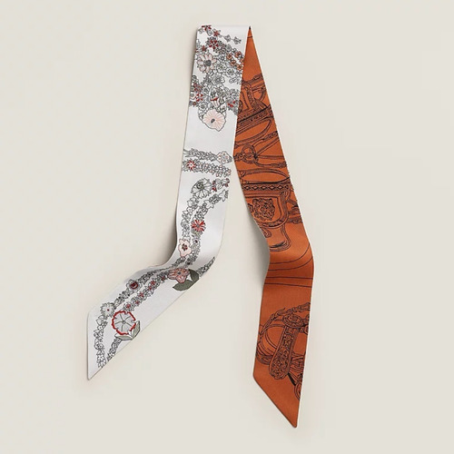 Hermes Splendid Bridle Floral Silk Twill Double Sided Twilly Scarf 100% Silk Print Scarf 에르메스 스플렌디드 브라이들 플로럴 실크 트윌 더블사이드 트윌리 스카프 PHMS2520 86cm