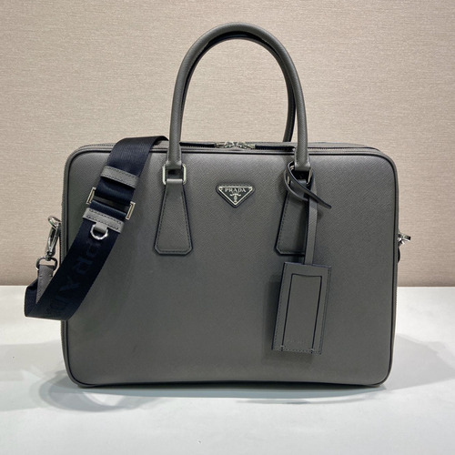 고객님께서 지금보시고 계시는 상품은 프라다 Saffiano Leather 더블 컴파트먼트 브리프케이스로, 프라다의 대표 소재인 사피아노 가죽을 사용하여 제작된 고급 비즈니스 가방입니다. 스크래치에 강하고 내구성이 뛰어난 사피아노 레더 특유의 질감이 세련된 분위기를 연출하며, 시간이 지나도 변함없는 클래식한 디자인으로 꾸준한 인기를 얻고 있는 모델입니다.