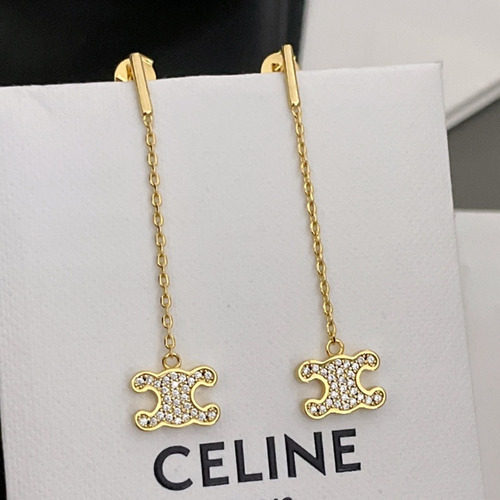 Celine Triomphe Full Crystal Brass Gold Plated Long Chain Drop Earring with Logo Pendant 셀린느 트리옹프 풀 크리스탈 황동 골드도금 롱 체인 드롭 이어링 로고 펜던트 |