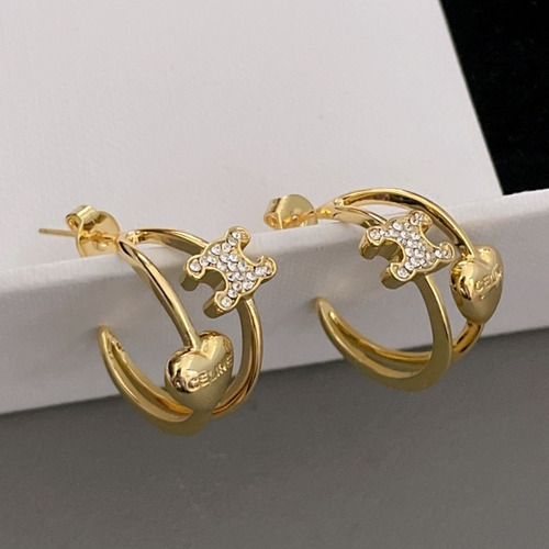 Celine Triomphe Heart Brass Gold Plated Curved Stud Earring with Logo Detail 셀린느 트리옹프 하트 황동 골드도금 커브드 스터드 이어링 로고 디테일 |