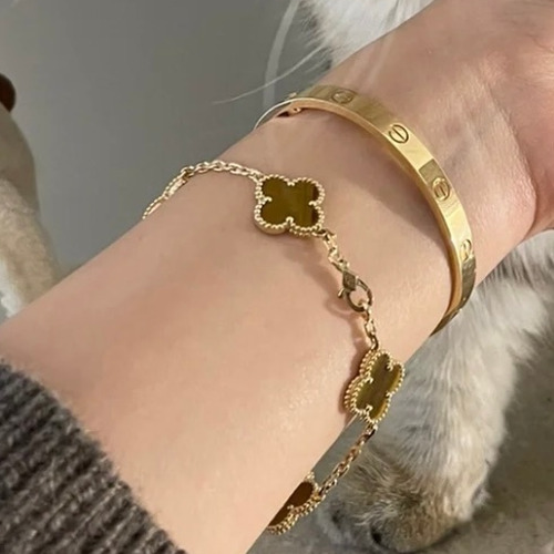 고객님께서 지금보시고 계시는 상품은 반클리프아펠 알함브라 파이브 클로버 디자인을 기반으로 제작된 브레이슬릿으로, 다양한 천연 스톤이 조화를 이루는 아이템입니다. 말라카이트, 오닉스, 카넬리안, 자개 등 서로 다른 컬러와 질감을 지닌 스톤이 균형 있게 배열되어 손목 위에서 우아한 실루엣을 완성합니다. 입체적인 비드 디테일과 정교한 연결 구조가 더해져 완성도를 높였습니다. 구성품: 정품 박스, 더스트백, 쇼핑백, 구매 영수증 포함 천연 스톤 조합으로 고급스러운 컬러감 연출 클로버 디자인으로 우아한 스타일 완성 데일리 및 포인트 스타일 모두 활용 가능 정밀 가공 기반의 고급 마감 디테일