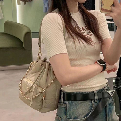 고객님께서 지금보시고 계시는 상품은 프라다의 리나일론 소재에 퀼팅 디테일을 더해 세련된 감성과 실용성을 동시에 갖춘 버킷백입니다. 입체적인 다이아몬드 퀼팅 패턴이 특징이며, 전면 트라이앵글 로고로 브랜드 아이덴티티를 강조한 디자인입니다. 체인 스트랩과 가죽 숄더 스트랩이 함께 구성되어 다양한 스타일로 연출이 가능하며, 일상과 외출 모두에 활용도가 높은 제품입니다. 구성품: 정품 박스, 더스트백, 쇼핑백, 구매 영수증 포함 체인 및 가죽 스트랩 구성으로 다양한 연출 가능 퀼팅 디자인으로 세련된 스타일 연출 가벼운 리나일론 소재로 편안한 사용 가능 데일리 및 외출용으로 활용 가능