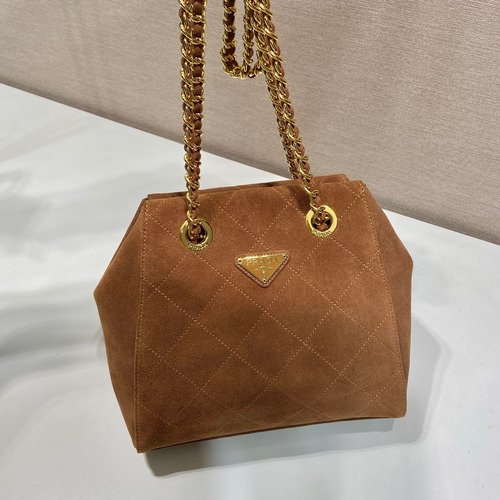 고객님께서 지금보시고 계시는 상품은 프라다의 스웨이드 가죽으로 제작된 퀼팅 호보백으로, 빈티지 감성과 세련된 디자인이 조화를 이루는 제품입니다. 부드러운 질감과 여유로운 실루엣이 돋보이며, 다양한 스타일에 자연스럽게 어울리는 아이템입니다. 구성품: 정품 박스, 더스트백, 쇼핑백, 구매 영수증 포함 스웨이드 가죽으로 제작된 퀼팅 호보백 체인 스트랩으로 다양한 착용 가능 드로스트링 구조로 실용적인 수납 가능 데일리 및 외출용으로 활용도 높은 디자인