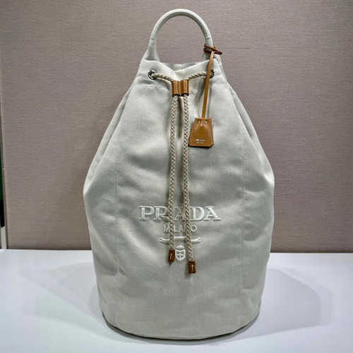 Prada Linen Blend Drawstring Travel Bag with Leather Trim and Logo 프라다 린넨 혼방 드로스트링 레더 트림 로고 트래블백 2VY011 34cm |