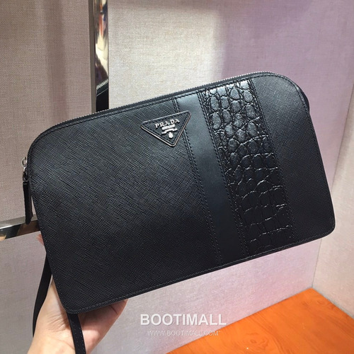 Prada Saffiano Leather Clutch Bag with Crocodile Trim and Wrist Strap 프라다 사피아노 레더 크로커다일 트림 손목 스트랩 클러치백 2VF056D 26.5cm |