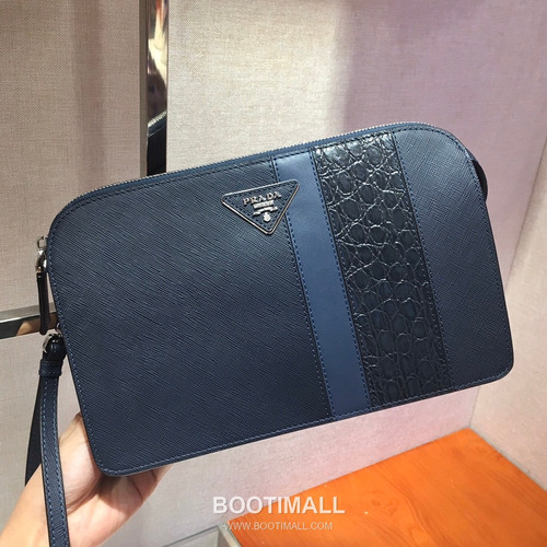 Prada Saffiano Leather Clutch Bag with Crocodile Trim and Wrist Strap 프라다 사피아노 레더 크로커다일 트림 손목 스트랩 클러치백 2VF056D 26.5cm |