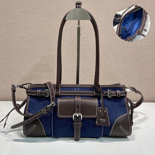 Prada Bonnie Denim Tote Bag with Calfskin Trim and Contrast Stitch Detail 프라다 보니 데님 카프스킨 트림 콘트라스트 스티치 토트백 1BA426 32cm |