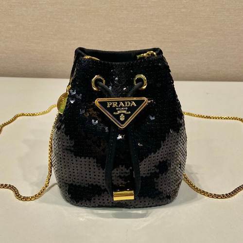 Prada Sequin Embroidered Satin Bucket Bag with Chain Strap and Triangle Logo 프라다 스팽글 자수 새틴 체인스트랩 삼각로고 버킷백 1NR016 10cm |