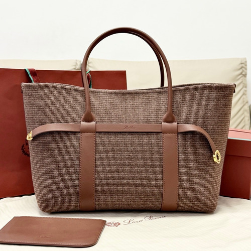 Loro Piana Ghiera Shopper Irish Silk Tweed Leather Trim Tote Bag with Metal Buckle Detail 로로피아나 기에라 쇼퍼 아이리쉬 실크 트위드 카멜 토트백 FAO7463 40cm 2