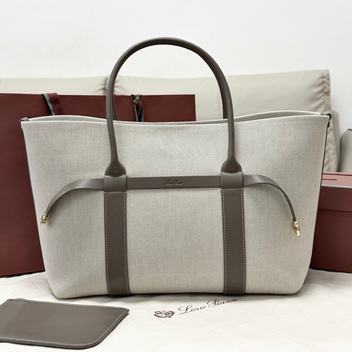 Loro Piana Ghiera Shopper Cotton Linen Canvas Leather Trim Tote Bag with Ring Buckle Detail 로로피아나 기에라 쇼퍼 코튼 린넨 캔버스 그레이 토트백 FAO7475 40cm |