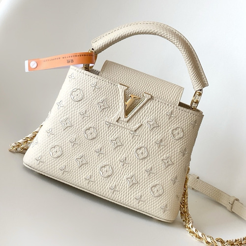 고객님께서 지금보시고 계시는 상품은 루이비통 카퓌신 BB 리자드 엠보스드 레더 탑핸들 숄더백입니다. 리자드 엠보스드 가죽 외부와 부드러운 램스킨 내부가 조화를 이루어 고급스러운 질감을 완성한 제품입니다. 플랩 구조를 활용하여 LV 로고를 노출하거나 모노그램 플라워를 강조하는 두 가지 스타일 연출이 가능하며, 세련된 디자인과 실용성을 동시에 갖추고 있습니다. 탑핸들과 탈부착 가능한 스트랩을 통해 다양한 착용이 가능하며, 적절한 내부 공간으로 필수 소지품을 효율적으로 수납할 수 있습니다. 구성품: 정품 박스, 더스트백, 쇼핑백, 구매 영수증 포함 리자드 엠보스드 가죽 외부 적용 램스킨 내부 안감 구성 플랩 구조로 두 가지 스타일 연출 가능 탑핸들 및 스트랩 구성