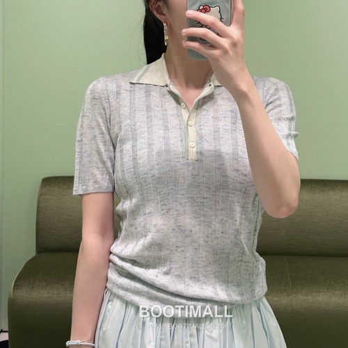 Prada SS26 Cotton Knit Polo T-Shirt Contrast Collar Button Logo 프라다 SS26 코튼 니트 폴로 반팔 티셔츠 배색 카라 버튼 로고 블루 티셔츠 |