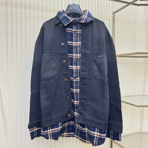 발렌시아가 2026SS 체크 셔츠 레이어드 데님 루즈핏 롱슬리브 블루 재킷 Balenciaga 2026 SS Check Shirt Layered Denim Loose Fit Long Sleeve Blue Jacket |