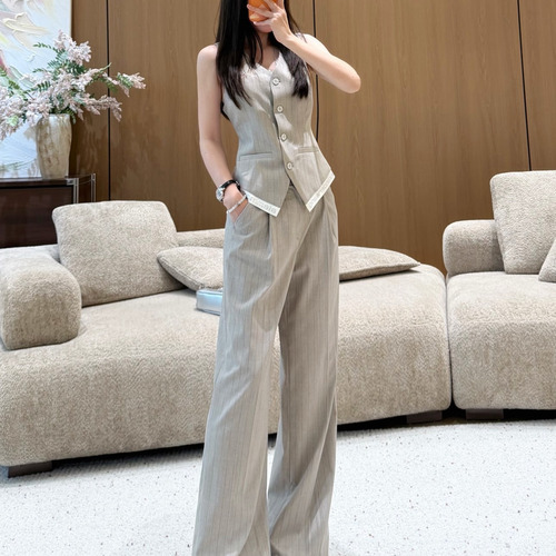 알렉산더왕 2026SS 폴리혼방 스트라이프 로고자수 싱글버튼 베스트 와이드팬츠 셋업 Alexander Wang 2026 SS Polyester Blend Stripe Logo Embroidered Single Button Vest Wide Pants Set |