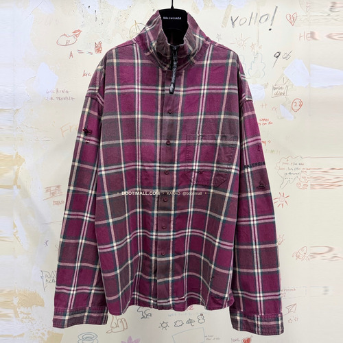 발렌시아가 2025FW 레드체크 워싱 루즈핏 스탠드카라 지퍼 셔츠재킷 Balenciaga 2025 FW Red Check Washed Loose Fit Stand Collar Zip Shirt Jacket |
