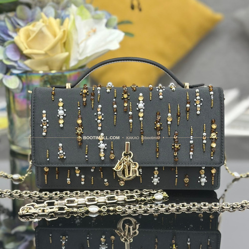 디테일 까나쥬 패턴, 크리스탈 자수, D.I.O.R 참, 체인 스트랩, 탑핸들