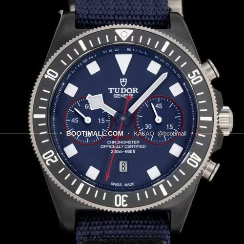 • 43mm 카본 복합 케이스로 가볍고 강한 내구성을 제공합니다. • 블루 다이얼과 레드 디테일로 뛰어난 시인성을 제공합니다. • 7750 기반 자동 크로노그래프 무브먼트로 안정적인 성능을 제공합니다. • 양방향 회전 베젤과 120클릭 구조로 정밀한 조작이 가능합니다. • 일체형 직조 스트랩으로 편안한 착용감을 제공합니다. • 정품 박스, 더스트백, 구매 영수증이 포함된 풀 패키지로 제공됩니다. |