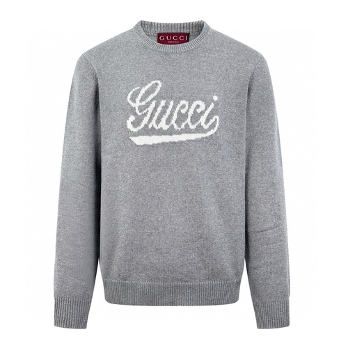 구찌의 묙화 니트 모직 의류입니다. 정선된 품질의 면사로 제작되어 고급스러움을 더했습니다. 옅은 회색으로 디자인되어 있으며, 순백색의 구찌 브랜드 로고가 돋보입니다.