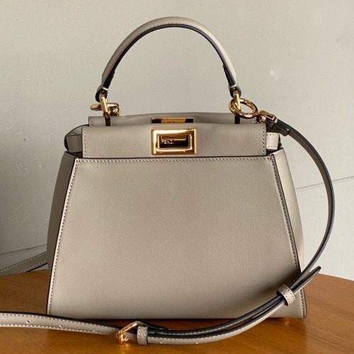 내용: 펜디의 아이코닉 라인인 피카부 스몰 토트백입니다. 부드러운 비둘기그레이 컬러의 가죽에 고급스러운 골드 톤 금속 장식을 더해 세련된 분위기를 완성했습니다. 상단 핸들과 탈부착 가능한 롱 스트랩이 함께 구성되어 토트, 숄더, 크로스백으로 다양하게 연출할 수 있습니다. 내부는 두 개의 수납 공간과 지퍼 포켓으로 구성되어 실용적이며, 견고한 구조로 형태가 잘 유지됩니다. 포멀한 오피스 룩부터 캐주얼한 데일리 스타일까지 폭넓게 매치하기 좋은 아이템입니다.