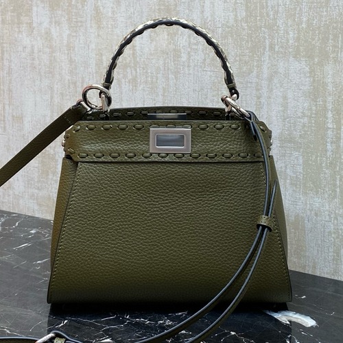 내용: FENDI mini peekaboo 미니 피카부 올리브 그린 토트백은 세련된 카키 톤과 입체적인 그레인 가죽이 조화를 이루는 아이템입니다. 상단의 위빙 핸들과 스티치 디테일이 고급스러운 포인트를 더해주며, 탈부착 가능한 스트랩으로 토트와 크로스백 두 가지 스타일로 연출할 수 있습니다. 컴팩트한 사이즈지만 수납력이 뛰어나 일상용은 물론 격식 있는 자리에도 잘 어울리는 실용적인 명품 백입니다.