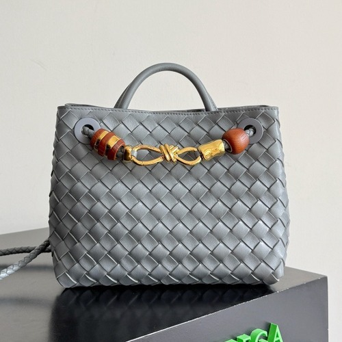 내용: BV의 신상 Andiamo 백을 모티프로 한 인트레치아토 위빙 토트 크로스백입니다. 부드러운 가죽을 촘촘하게 엮어 만든 바디에 골드 톤 메탈과 우드 비즈 장식을 더해 세련된 포인트를 주었습니다. 상단 핸들과 길이 조절 가능한 위빙 스트랩이 있어 토트, 숄더, 크로스 등 다양한 스타일로 연출할 수 있으며, 적당한 수납력으로 데일리 출근룩부터 주말 캐주얼까지 두루 활용하기 좋습니다. 중성적인 그레이 컬러가 어떤 코디에도 자연스럽게 어울려 실용성과 스타일을 모두 만족시켜 줍니다.