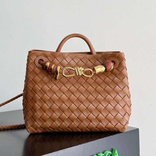 내용: BV의 신상 Andiamo 백으로, 브랜드 시그니처인 인트레치아토 위빙이 돋보이는 브라운 컬러 가죽 숄더 토트백입니다. 부드러운 가죽 바디에 골드 메탈과 우드 디테일 장식이 더해져 세련된 포인트를 주며, 상단 핸들과 조절 가능한 숄더 스트랩으로 토트·숄더·크로스 등 다양한 연출이 가능합니다. 일상 통근부터 주말 나들이까지 활용도가 높고, 여유 있는 수납력으로 실용성까지 갖춘 아이템입니다. 클래식하면서도 현대적인 감성을 동시에 느낄 수 있는 타임리스 백입니다.