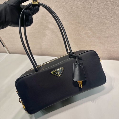 내용: 프라다 Tessuto Tocker Re-Nylon 토트백은 직사각형 실루엣과 미니멀한 디자인이 돋보이는 아이템입니다. 재생 나일론(Re-Nylon)과 부드러운 소가죽 트리밍을 사용해 가볍지만 탄탄한 내구성을 자랑하며, 골드 톤 메탈 장식과 앞면의 에나멜 트라이앵글 로고가 고급스러운 포인트를 더합니다. 상단 지퍼 여밈과 잠금장치, 키 참 디테일로 보안성과 장식성을 모두 갖추었고, 길게 디자인된 더블 핸들로 손에 들거나 어깨에 가볍게 멜 수 있습니다. 실용적인 수납공간과 세련된 블랙 컬러로 데일리룩부터 격식 있는 스타일까지 폭넓게 활용하기 좋은 토트백입니다.